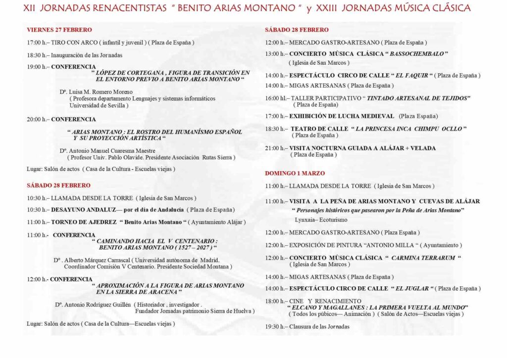 El ayuntamiento serrano de Alájar viene celebrando las Jornadas de Música Renacentista Arias Montano desde 2003, y las Renacentistas desde 2013, en honor a su ilustre vecino Benito Arias Montano (1527-1598), quien a pesar de nacer en Fregenal de la Sierra y después de su gran formación intelectual y dirigir la edición de la Biblia Políglota de Amberes (Biblia Regia) para Felipe II, así como ser el primer bibliotecario de El Escorial, decidió retirarse durante 39 años a la Peña de Alájar, conocida como la Peña de Arias Montano. Entre su amplia obra podemos destacar Humanae salutis monumenta (1571) y Antiquitatum Judaicarum (1593).